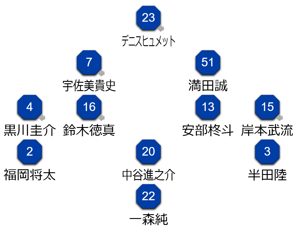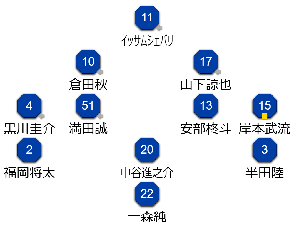 FW 7 宇佐美 貴史56’【4・5】サイドの守備をぼかしながら前にプレスをかける、ということが苦手中の苦手なのがよくわかる試合でした。相手とフォーメーションがかみ合えば、前への強度は若いころよりは出せるようになりましたが、後ろが変化して気になり始めると、そこを味方と連動して解決することは一切できません。2シャドーで守備の役割を果たすのは、時間がかかえいそうです。